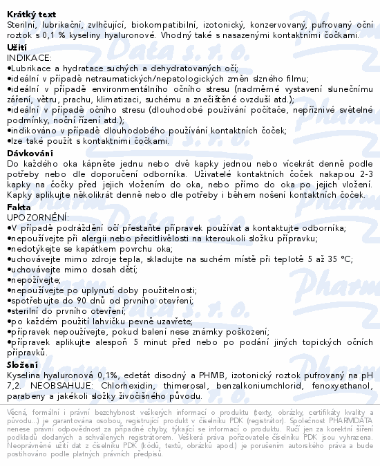 Sterilní, lubrikační, zvlhčující, biokompatibilní, izotonický, konzervovaný, pufrovaný oční roztok s 0, 1 % kyseliny hyaluronové. Vhodný také s nasazenými kontaktními čočkami.