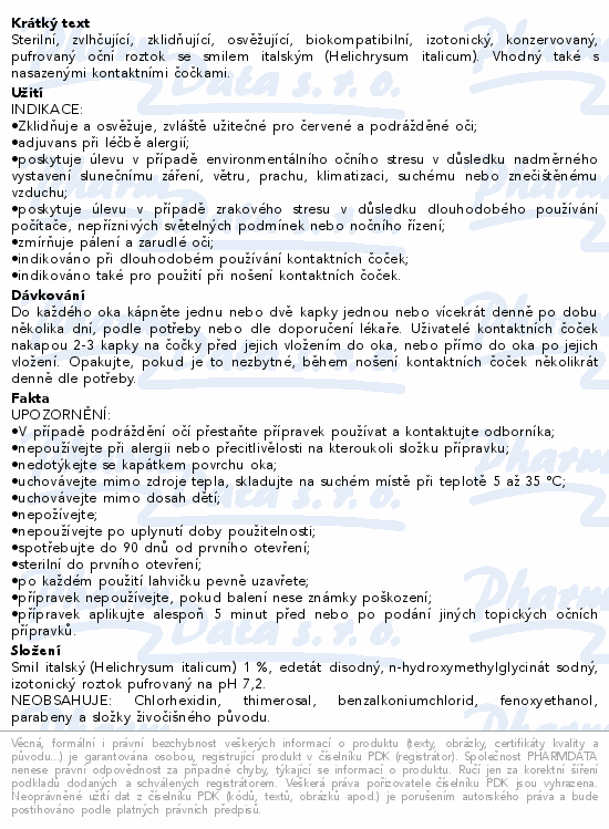 Sterilní, zvlhčující, zklidňující, osvěžující, biokompatibilní, izotonický, konzervovaný, pufrovaný oční roztok se smilem italským (Helichrysum italicum). Vhodný také s nasazenými kontaktními čočkami.