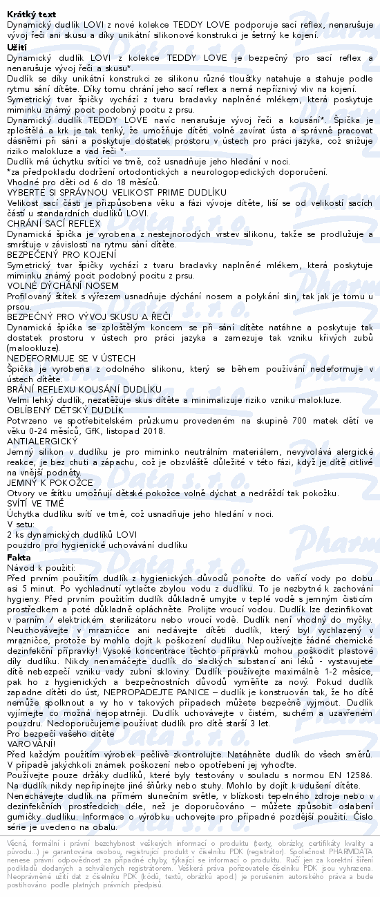 Dynamický dudlík LOVI z nové kolekce TEDDY LOVE podporuje sací reflex, nenarušuje vývoj řeči ani skusu a díky unikátní silikonové konstrukci je šetrný ke kojení.