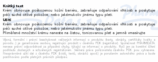 Krém obnovuje poškozenou kožní bariéru, zabraňuje odpařování vlhkosti a poskytuje péči suché citlivé pokožce, nebo jakémukoliv jinému typu pleti.
