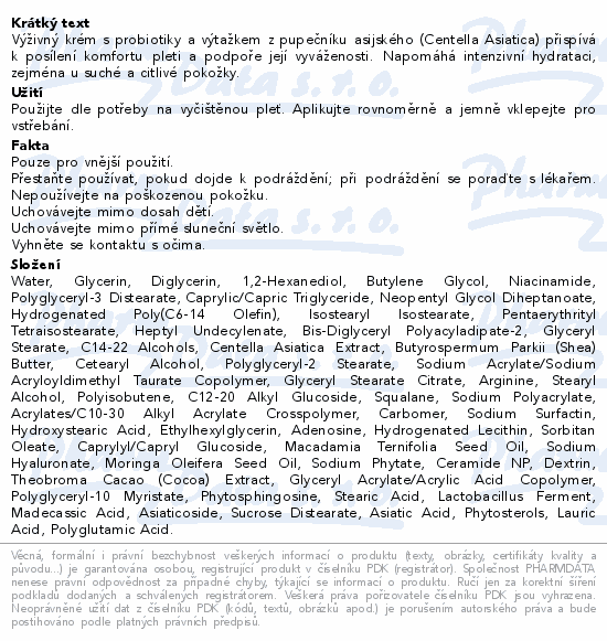 Výživný krém s probiotiky a výtažkem z pupečníku asijského (Centella Asiatica) přispívá k posílení komfortu pleti a podpoře její vyváženosti. Napomáhá intenzivní hydrataci, zejména u suché a citlivé pokožky.