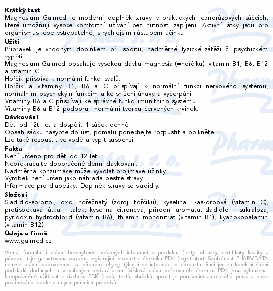 Magnesium Galmed je moderní doplněk stravy v praktických jednorázových sáčcích, které umožňují vysoce komfortní užívání bez nutnosti zapíjení. Aktivní látky jsou pro organismus lépe vstřebatelné, s rychlejším nástupem účinku.