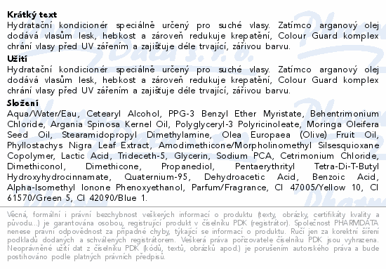 Hydratační kondicionér speciálně určený pro suché vlasy. Zatímco arganový olej dodává vlasům lesk, hebkost a zároveň redukuje krepatění, Colour Guard komplex chrání vlasy před UV zářením a zajišťuje déle trvající, zářivou barvu.