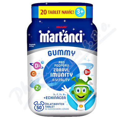 Marťánci Gummy s echinaceou jsou chutné želatinové tablety, které obsahují doporučené denní dávky důležitých vitamínů pro správný fyziologický růst a vývoj dítěte.