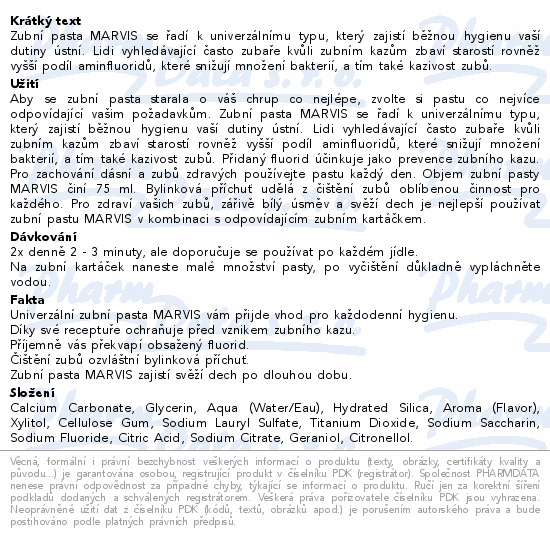 Zubní pasta MARVIS se řadí k univerzálnímu typu, který zajistí běžnou hygienu vaší dutiny ústní. Lidi vyhledávající často zubaře kvůli zubním kazům zbaví starostí rovněž vyšší podíl aminfluoridů, které snižují množení bakterií, a tím také kazivost zubů.