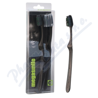 MegaSmile zubní kartáček Black Whitening - duopack - s patentovanou technologií aktivního uhlí. Neutralizuje odolná zabarvení na zubech přirozeným způsobem a zesvětluje zuby bez pomoci chemických přídavných látek. Přirozeně zářivý úsměv bez patiny.