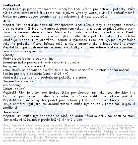 Mepitel Film je jemné transparentní prodyšné krytí určené pro ochranu pokožky. Může být použito samostatně či v kombinaci s jinými výrobky. Udržuje vlhké prostředí v ráně. Přesto umožňuje odvod vodních par a nadbytečné vlhkosti z pokožky.