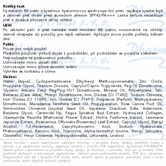 Hydratační BB krém s kyselinou hyaluronovou sjednocuje tón pleti, zajišťuje vysoké krytí a zároveň pleť chrání před slunečním zářením SPF42