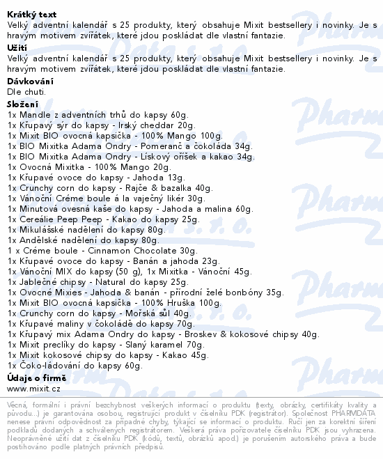 Velký adventní kalendář s 25 produkty, který obsahuje Mixit bestsellery i novinky. Je s hravým motivem zvířátek, které jdou poskládat dle vlastní fantazie.