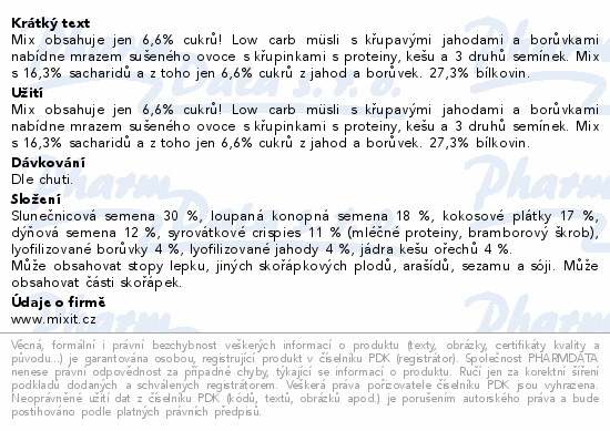 Mix obsahuje jen 6, 6% cukrů! Low carb müsli s křupavými jahodami a borůvkami nabídne mrazem sušeného ovoce s křupinkami s proteiny, kešu a 3 druhů semínek. Mix s 16, 3% sacharidů a z toho jen 6, 6% cukrů z jahod a borůvek. 27, 3% bílkovin.