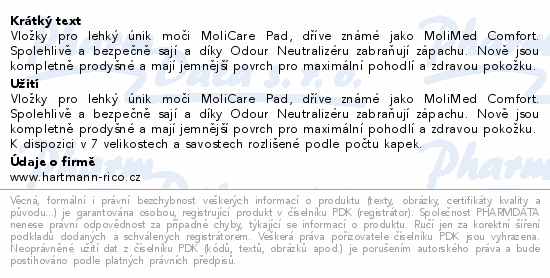 Vložky pro lehký únik moči MoliCare Pad, dříve známé jako MoliMed Comfort. Spolehlivě a bezpečně sají a díky Odour Neutralizéru zabraňují zápachu. Nově jsou kompletně prodyšné a mají jemnější povrch pro maximální pohodlí a zdravou pokožku.