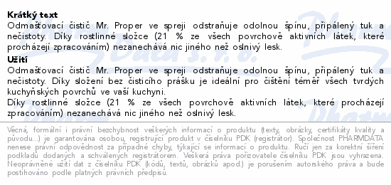 Odmašťovací čistič Mr. Proper ve spreji odstraňuje odolnou špínu, připálený tuk a nečistoty. Díky rostlinné složce (21 % ze všech povrchově aktivních látek, které procházejí zpracováním) nezanechává nic jiného než oslnivý lesk.