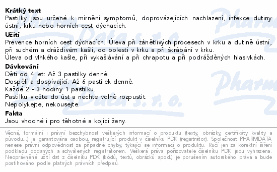 Pastilky jsou určené k mírnění symptomů, doprovázejících nachlazení, infekce dutiny ústní, krku nebo horních cest dýchacích.
