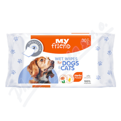 My Friend vlhčené ubrousky šetrně čistí oční okolí psů a koček. Obsahují měsíček lékařský a vitamín E pro jemnou péči. Jsou bez parfemace, což snižuje riziko podráždění.