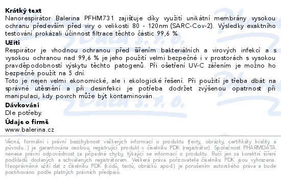 Nanorespirátor Balerina PFHM731 zajišťuje díky využití unikátní membrány vysokou ochranu především před viry o velikosti 80 - 120nm (SARC-Cov-2). Výsledky exaktního testování prokázali účinnost filtrace těchto částic 99, 6 %.