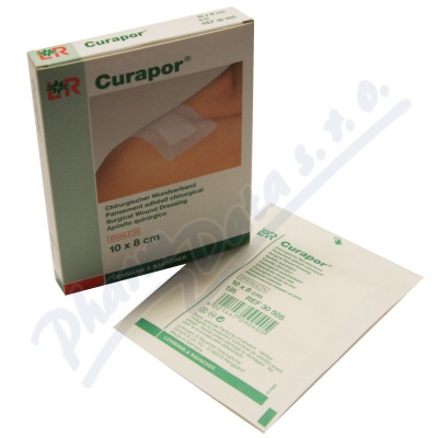 Obvaz na rány CURAPOR samolepicí, sterilní, 10x8 cm, REF 30505, VZP 80579. Transparentní chirurgický obvaz z vodotěsné a prodyšné fólie. K sterilnímu ošetření pooperačních ran, náhodného poranění a řezných ran a oděrek, pro miniinvazivní chirurgii.