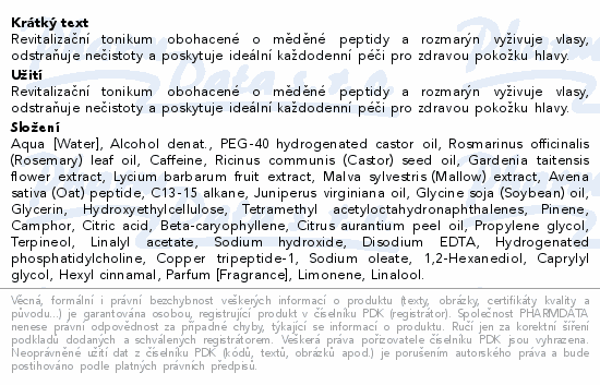 Revitalizační tonikum obohacené o měděné peptidy a rozmarýn vyživuje vlasy, odstraňuje nečistoty a poskytuje ideální každodenní péči pro zdravou pokožku hlavy.