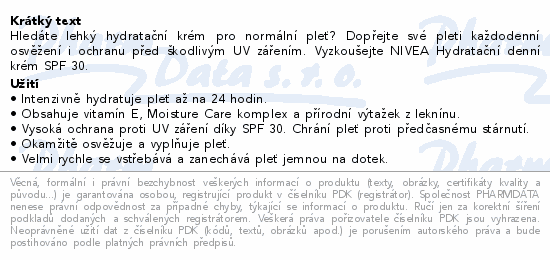 Hledáte lehký hydratační krém pro normální pleť? Dopřejte své pleti každodenní osvěžení i ochranu před škodlivým UV zářením. Vyzkoušejte NIVEA Hydratační denní krém SPF 30.
