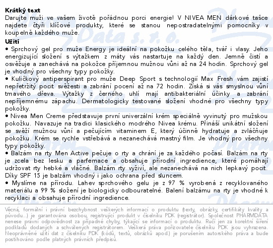 Darujte muži ve vašem životě pořádnou porci energie! V NIVEA MEN dárkové tašce najdete čtyři klíčové produkty, které se stanou nepostradatelnými pomocníky v koupelně každého muže.