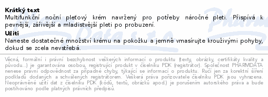 Multifunkční noční pleťový krém navržený pro potřeby náročné pleti. Přispívá k pevnější, zářivější a mladistvější pleti po probuzení.