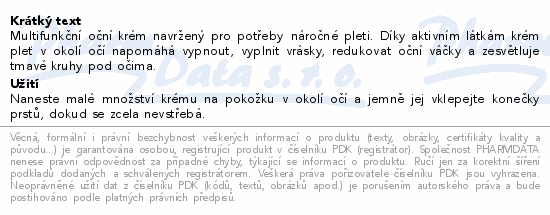 Multifunkční oční krém navržený pro potřeby náročné pleti. Díky aktivním látkám krém pleť v okolí očí napomáhá vypnout, vyplnit vrásky, redukovat oční váčky a zesvětluje tmavé kruhy pod očima.