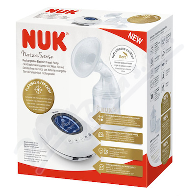 Nabíjecí el. prsní pumpa NUK Nature Sense vč. zásobníku na mateř. mléko NUK Nature Sense 150ml. Tichá výkonná pumpa s max. 330 mbar. 16 programů s různým rytmem a intenzitou odsávání (4 rytmy x 4 intenzity odsávání). Paměťová funkce pro oblíbený program.