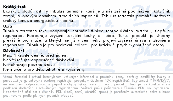Extrakt z plodů rostliny Tribulus terrestris, která je u nás známá pod názvem kotvičník zemní, s vysokým obsahem steroidních saponinů. Tribulus terrestris pomáhá udržovat svalový tonus a energetickou hladinu.
