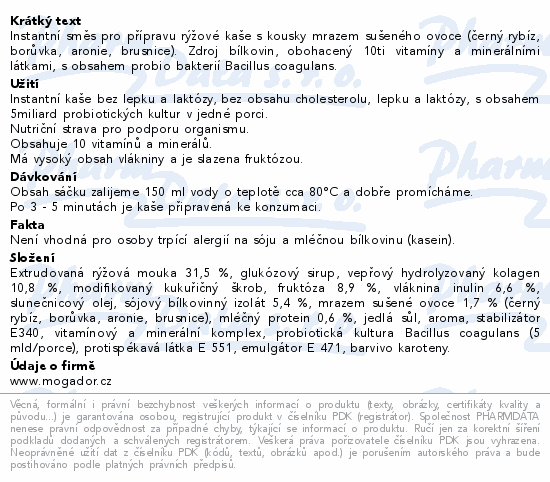 Instantní směs pro přípravu rýžové kaše s kousky mrazem sušeného ovoce (černý rybíz, borůvka, aronie, brusnice). Zdroj bílkovin, obohacený 10ti vitamíny a minerálními látkami, s obsahem probio bakterií Bacillus coagulans.