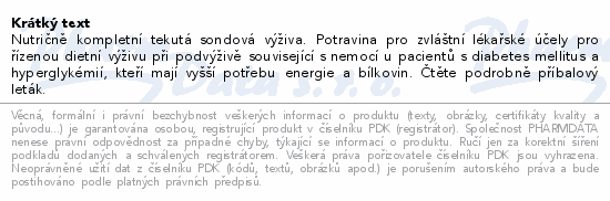 Nutričně kompletní tekutá sondová výživa. Potravina pro zvláštní lékařské účely pro řízenou dietní výživu při podvýživě související s nemocí u pacientů s diabetes mellitus a hyperglykémií, kteří mají vyšší potřebu energie a bílkovin. Čtěte pozorně příbalový leták.