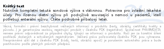 Nutričně kompletní tekutá sondová výživa s vlákninou. Potravina pro zvláštní lékařské účely. Pro řízenou dietní výživu při podvýživě související s nemocí u pacientů, kteří potřebují enterální výživu. Čtěte pozorně příbalový leták.