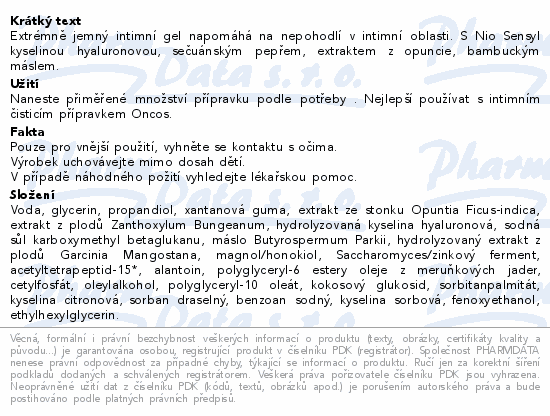 Extrémně jemný intimní gel napomáhá na nepohodlí v intimní oblasti. S Nio Sensyl kyselinou hyaluronovou, sečuánským pepřem, extraktem z opuncie, bambuckým máslem.