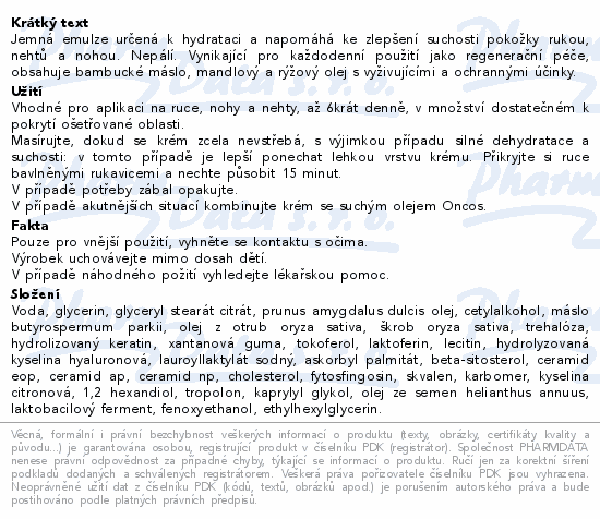 Jemná emulze určená k hydrataci a napomáhá ke zlepšení suchosti pokožky rukou, nehtů a nohou. Nepálí. Vynikající pro každodenní použití jako regenerační péče, obsahuje bambucké máslo, mandlový a rýžový olej s vyživujícími a ochrannými účinky.