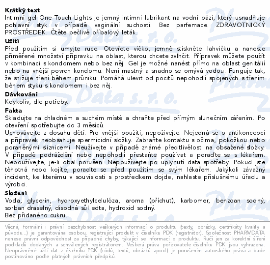 Intimní gel One Touch Lights je jemný intimní lubrikant na vodní bázi, který usnadňuje pohlavní styk v případě vaginální suchosti. Bez parfemace. ZDRAVOTNICKÝ PROSTŘEDEK. Čtěte pečlivě příbalový leták.