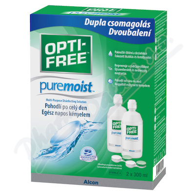 OPTI-FREE PureMoist víceúčelový dezinfekční roztok a pouzdro na kontaktní čočky společnosti Alcon (ploché). Roztok OPTI-FREE PureMoist působí k čištění, dezinfekci a uchovávání měkkých kontaktních čoček (včetně silikon-hydrogelových čoček).