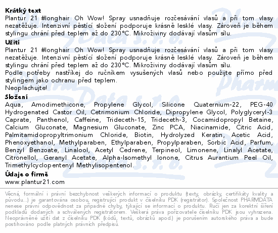Plantur 21 #longhair Oh Wow! Spray usnadňuje rozčesávání vlasů a při tom vlasy nezatěžuje. Intenzivní pěstící složení podporuje krásně lesklé vlasy. Zároveň je během stylingu chrání před teplem až do 230°C. Mikroživiny dodávají vlasům sílu.