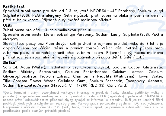 Speciální zubní pasta pro děti od 0-3 let, která NEOBSAHUJE Parabeny, Sodium Lauryl Sulphate (SLS), PEG a alergeny. Šetrně působí proti zubnímu plaku a pomáhá chránit před zubním kazem. Příjemná a výjimečná malinová příchuť.