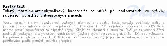 Tekutý vitamino-aminokyselinový koncentrát se užívá při nedostatcích ve výživě, nutričních poruchách, stressovéých stavech.