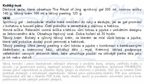 Dárková sada, která obsahuje The Ritual of Jing sprchový gel 200 ml, vonnou svíčku 140 g, tělový krém 100 ml a tělový peeling 125 g.