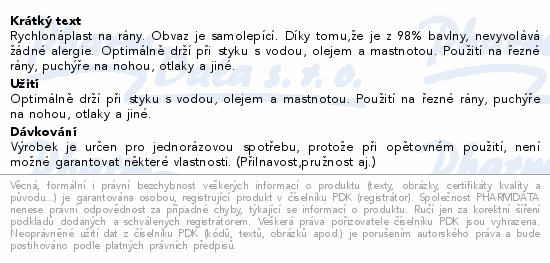 Rychlonáplast na rány. Obvaz je samolepící. Díky tomu, že je z 98% bavlny, nevyvolává žádné alergie. Optimálně drží při styku s vodou, olejem a mastnotou. Použití na řezné rány, puchýře na nohou, otlaky a jiné.