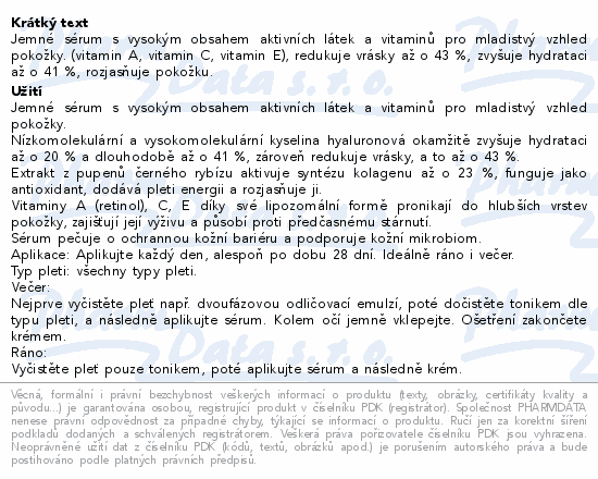 Jemné sérum s vysokým obsahem aktivních látek a vitaminů pro mladistvý vzhled pokožky. (vitamin A, vitamin C, vitamin E), redukuje vrásky až o 43 %, zvyšuje hydrataci až o 41 %, rozjasňuje pokožku.