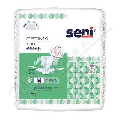 Seni Optima Trio Medium představují plenkové kalhotky s nastavitelným obvodem pasu (boky 70-105cm). Jsou to prodyšné pleny pro dospělé s velmi těžkým stupněm inkontinence. Spojují výhody plenkových kalhotek a anatomicky tvarovaných plen. Savost 2600ml.
