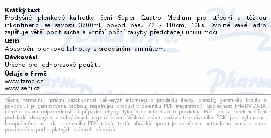 Prodyšné plenkové kalhotky Seni Super Quatro Medium pro střední a těžkou inkontinenci se savostí 3700ml, obvod pasu 72 - 110cm, 10ks. Dvojité savé jádro zajišťuje větší pocit sucha a vnitřní boční záhyby předcházejí úniku moči.