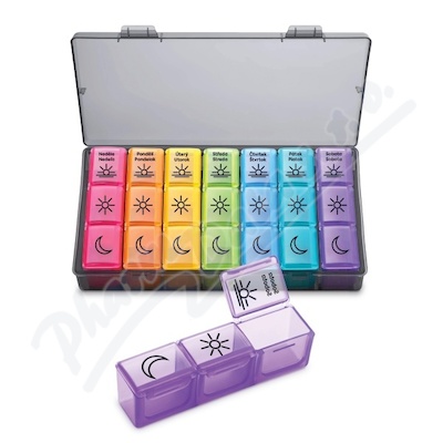 Cestovní dávkovač léků se zásuvnými boxy pro každý den v týdnu, přehledně...