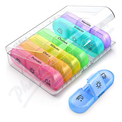 SimplyMed dávkovač léků se zásuvnými políčky pro každý den v týdnu, přehledně popsaný pro snadnou orientaci. Denní dávkovač je rozdělený na 3 části: Ráno-Poledne-Noc a lze jej použít i samostatně.