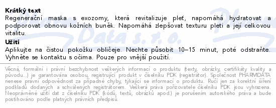 Regenerační maska s exozomy, která revitalizuje pleť, napomáhá hydratovat a podporovat obnovu kožních buněk. Napomáhá zlepšovat texturu pleti a její celkovou vitalitu.