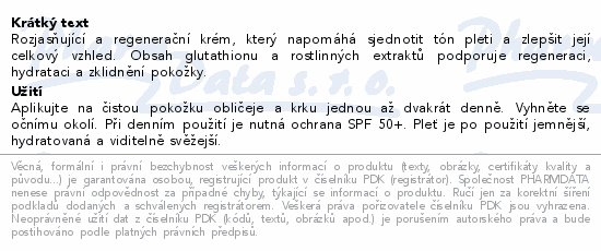 Rozjasňující a regenerační krém, který napomáhá sjednotit tón pleti a zlepšit její celkový vzhled. Obsah glutathionu a rostlinných extraktů podporuje regeneraci, hydrataci a zklidnění pokožky.