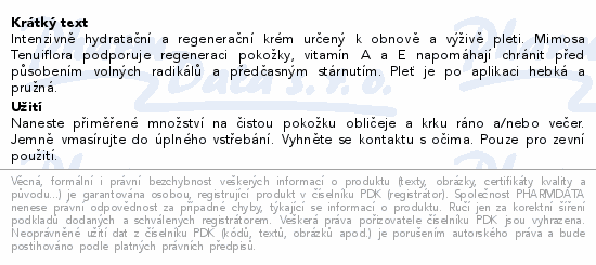 Intenzivně hydratační a regenerační krém určený k obnově a výživě pleti. Mimosa Tenuiflora podporuje regeneraci pokožky, vitamín A a E napomáhají chránit před působením volných radikálů a předčasným stárnutím. Pleť je po aplikaci hebká a pružná.
