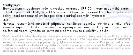 Širokospektrální opalovací krém s vysokou ochranou SPF 50+, který napomáhá chránit pokožku před UVA, UVB, IR a HEV zářením. Obsahuje moderní UV filtry a hydratační složky, které napomáhají chránit pokožku a udržují optimální hydrataci.