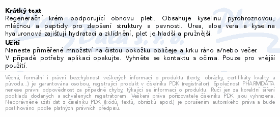 Regenerační krém podporující obnovu pleti. Obsahuje kyselinu pyrohroznovou, mléčnou a peptidy pro zlepšení struktury a pevnosti. Urea, aloe vera a kyselina hyaluronová zajišťují hydrataci a zklidnění, pleť je hladší a pružnější.