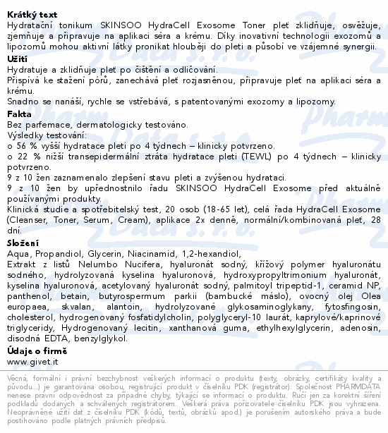Hydratační tonikum SKINSOO HydraCell Exosome Toner pleť zklidňuje, osvěžuje, zjemňuje a připravuje na aplikaci séra a krému. Díky inovativní technologii exozomů a lipozomů mohou aktivní látky pronikat hlouběji do pleti a působí ve vzájemné synergii.